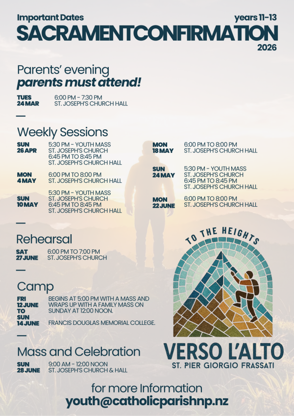 The Catholic Parish of New Plymouth offers an engaging and spirited Confirmation programme during Term 2. The programme consists of seven sessions, along with a weekend confirmation camp and Confirmation Mass on Sunday, 28 June 2026, at 9:00 am at St. Joseph's Church.