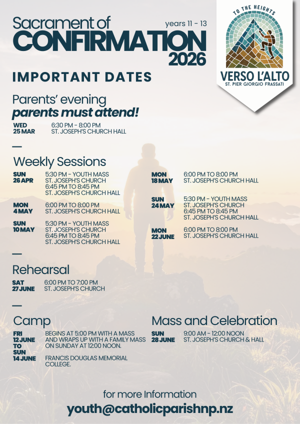 The Catholic Parish of New Plymouth offers an engaging and spirited Confirmation programme during Term 2. The programme consists of seven sessions, including a weekend confirmation camp and a Confirmation Mass on Sunday, 28 June 2026, at 9:00 am at St. Joseph's Church.